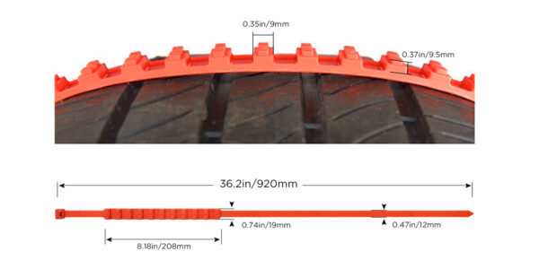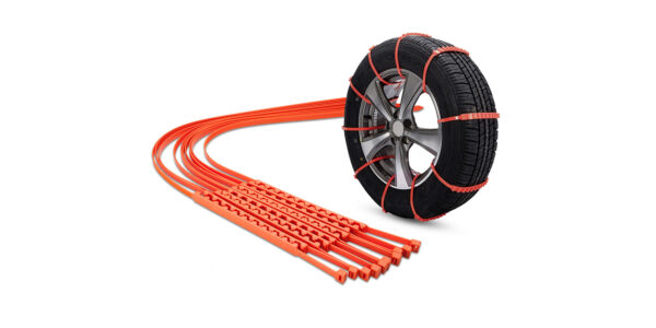 Car anti-skid snow and ice cable ties for vehicle tyres. The special anti-skid rough surface is specially designed so that it increases the friction between tyre and road in icy, snowy and even muddy conditions.