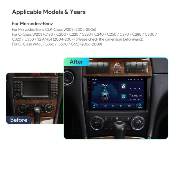 Android 13 Octa Core 4GB DDR4 RAM + 64GB Solid State ROM 9” 1280×720 HD IPS Screen Car Stereo Multimedia Player GPS Navigation System with Integrated global 4G Solution Built-in CarPlay & Android Auto & DSP High Power TDA7851 Amplifier USB Tethering Screen Mirroring TDA7708 RDS Radio Support AHD Camera Custom Fit for Mercedes-Benz CLK Class/C-Class/G-Class